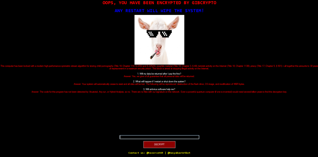 Gibcrypto ransomware is one of the latest ransomware with highly destructive capabilities. After the overall analysis of the malware, it can be concluded that it is unlikely to get the files back even if the ransom is paid.