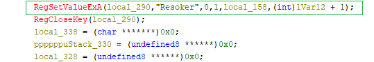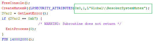 When we execute Resoker.exe, the malware creates a mutex named “Global\ResokerSystemMutex” using the Windows API CreateMutexW. This mutex acts as a simple check to make sure that only one instance of the malware runs on the system.