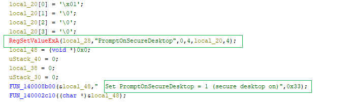The malware checks the PromptOnSecureDesktop setting, and if its value is 0, it modifies it to 1 (secure desktop ON).