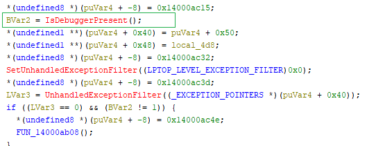 It uses IsDebuggerPresent to see if a debugger is attached to the process ( check if it is being analyzed or debugged). If a debugger is detected, it triggers a custom exception handling logic.
