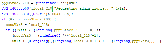 The malware attempts to relaunch the program with administrator privileges. It gets the path of the current executable and uses ShellExecuteExA with the “runas” option to start itself again with elevated rights.