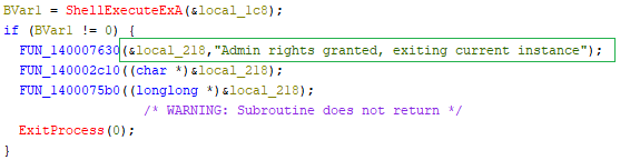 If the elevation is successful, the current process exits and the new elevated instance continues running. If the request fails, the program retrieves the error code and reports to the C2 server that it failed to obtain admin rights.