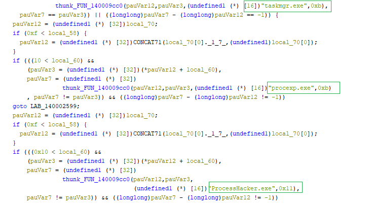 Checks the running processes using Process32NextW and checks their names. If specific monitoring or analysis tools are detected, the malware opens the process using OpenProcess and terminates it using TerminateProcess to prevent analysis.