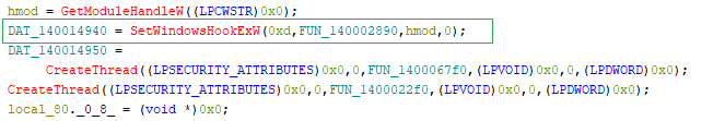 The malware installs a global keyboard hook using the Windows API SetWindowsHookExW with the WH_KEYBOARD_LL flag. This allows it to monitor keyboard input across the entire system.
