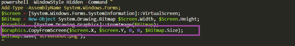 Since the command is executed with -WindowStyle Hidden, the screenshot is taken silently without showing any window to the user.