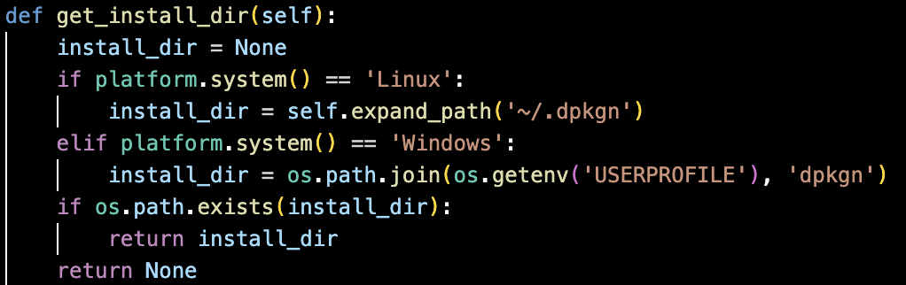 As shown in Figure 12, there is a function which checks the operating system and looks for a predefined installation folder in the user’s home directory specific to that operating system, allowing the malware to locate its files without needing administrator access.