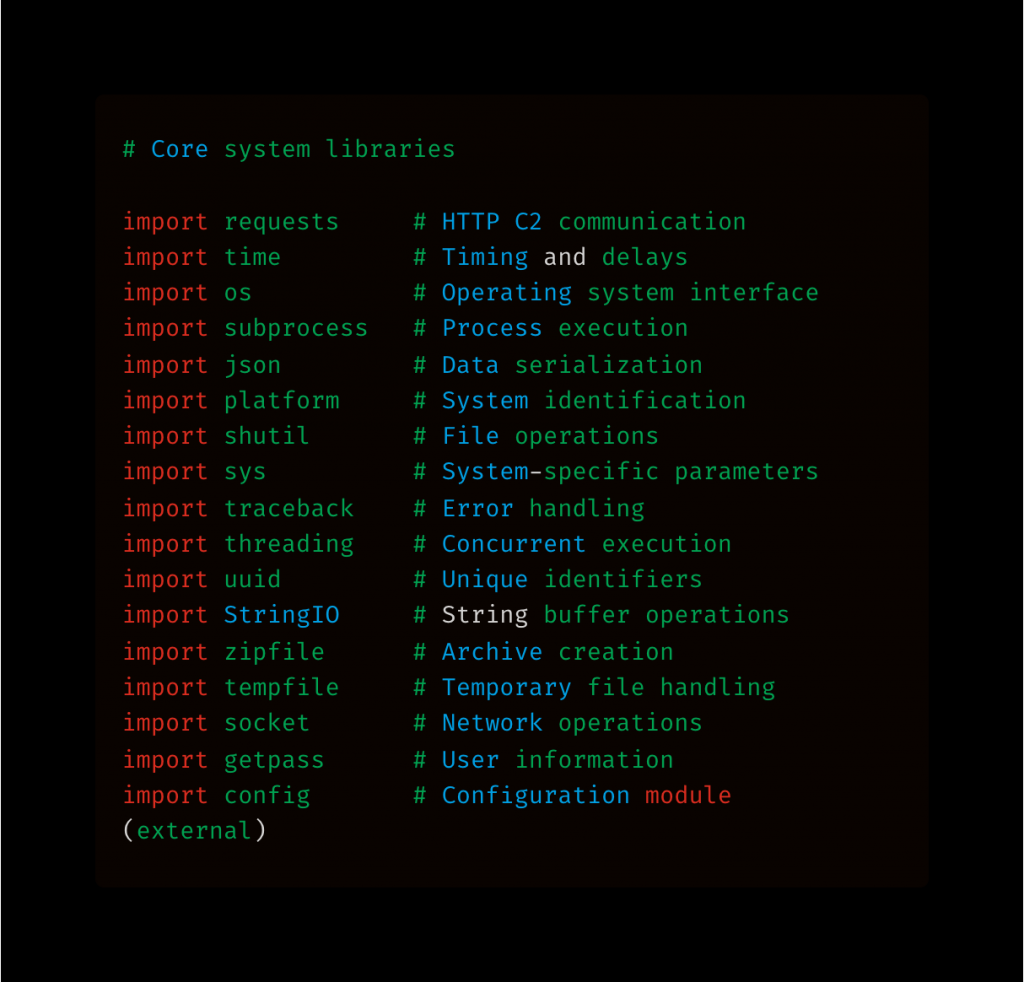 The way the file is structured and its imports arranged is as shown in Figure 3, and it suggests robust functionality. For example, requests and socket enable network communication, subprocess and os allow command execution and system interaction, and threading supports concurrent task execution. Additionally, the malware leverages widely adopted Python libraries such as json, platform, and shutil to perform common operational tasks. For example, json is used for structuring and exfiltrating collected data, while other libraries support system interaction and file handling.